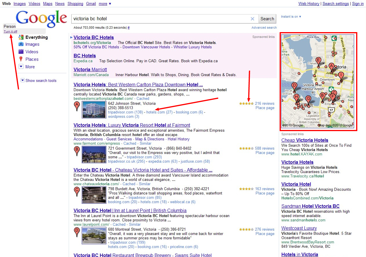 - Instead of an incongruous number of reviews next to the listing, the new results show the average review rating out of 5 stars along with a link to the reviews and the official Google Places Page for the business. (shown as the first arrow on the right)