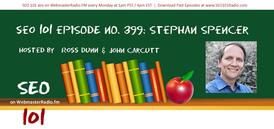 Welcome back to SEO 101 on webmasterradio.fm hosted by John Carcutt, the director of SEO for Advance Local, and myself, Ross Dunn, CEO of StepForth Web Marketing Inc. We’re joined today by Stephan Spencer, co-author of the Art of SEO, author of Google Power Search, founder of NetConcepts and an awesome business coach.