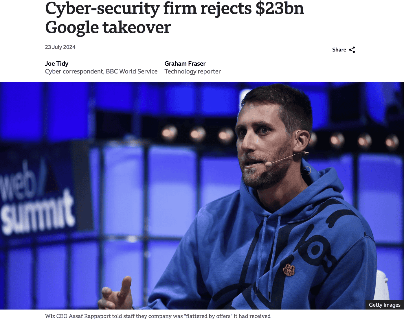 Cyber-security firm rejects $23bn Google takeover – WIZ Chief Executive Assaf Rappaport rejects Google’s $23bn takeover offer, aiming to become a top cybersecurity company and reach $1B in revenue before going public. The firm has been valued at $12B.