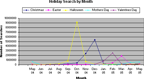 That conforms to StepForth’s weekly tracking of holiday related keyword terms which shows a steady rise in the use of Christmas related keyword phrases starting right about now. In May 2004, 73,276 people entered the word “Christmas” at Overture (now Yahoo Search Marketing). In July 2004, that number jumped to 90,215. In August 2004, there were 111,261 Overture searches for Christmas. By October 2004 there were nearly 415,000 searchers for the word Christmas. In November, the floodgates open with 2,426,425 searches, a number that more than doubled in December with 5,383,254 searches conducted for Christmas. A common thread in the study shared by all holiday related phrases shows interest starts to increase radically 90 – 120 days before the calendar date of the holiday.