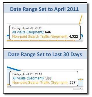 But next, when I add an advanced segment to show “non-paid search traffic” separately, Google tells me there was zero non-paid traffic up until April 29, then a massive spike with the non-paid surpassing all traffic something that it is simply impossible; (“all traffic” by definition must include “non-paid traffic”).
