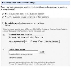 Why the option? If you are a destination business then your service area is extremely strict and localized (your location – that’s it). If, however, your services are based on house-calls then you now have the opportunity to say how wide your service area is – a valuable option previously unavailable. If you choose “this business serves customer at their locations” (hereto known as “house calls”) then you will be greeted with the additional options in 2, 3 and 4 below. - “Do not show my business address on my Maps listing” allows you to hide your business address while still having a presence in local listings. This will be incredibly helpful for home-based businesses and anyone else who has no interest in getting business visits to their place of residence. Note that I did read somewhere (sorry, I couldn’t find the reference) that at least one person noticed a drop in a local ranking when they disabled their address – so there appears to be a trade-off to this privacy option.