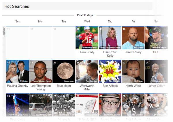Upon visiting Google Trends the default page is the latest “Hot Searches” on Google. If, however, you click on the calendar icon near the top of the page you will see the hottest searches for the past 30 days which oddly does not include Miley Cyrus’s profile (I am going to hell for this).