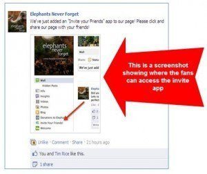 If your current fans are passionate about your page, they will want to share it with their friends. The only obstacle here is that it can be difficult for them to know how to go about doing it. What I did to make it easy for our fans to share our page was added an app called “Invite your Friends.” I then took a screenshot of it and added it as an image to my status that said “We’ve just added an “Invite your Friends” app to our page! Please click and share our page with your friends.”