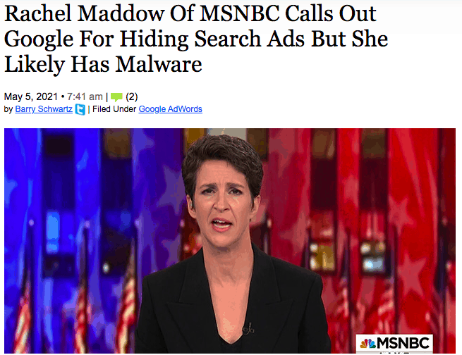 Ross: I love this next gaff, this is too funny. I’ll just mention it anyway. I got the gist of it. I didn’t see it happen. Rachel Maddow of MSNBC called out Google for hiding search ads. But she likely has malware on her computer. I think that’s so funny.
