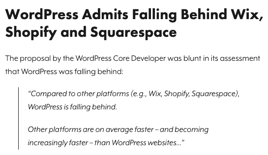 Scott: Yeah, so this is great. WordPress has put together a proposal for a performance team. They’ve admitted that they’re falling behind Wix (and I’ll get into Wix maybe in a second) and similar platforms and they are suggesting they need a performance team to help coordinate speed improvements. Their proposal notes that “compared to other platforms (for example: Wix, Shopify, Squarespace), WordPress is falling behind.