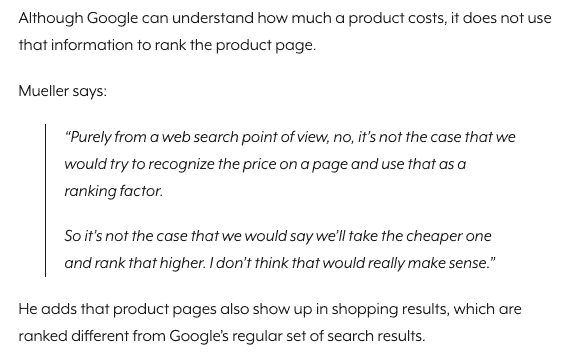 Ross: This is a Mueller file. He says, someone asked whether or not product price was a ranking factor, and this is of course in more ecommerce based search results, and the answer was — nope. Now, I’m not saying that that’s all he said but that’s really the answer. I mean, I could go on long winded on you but there’s just “no” that’s not it, they don’t look at it.