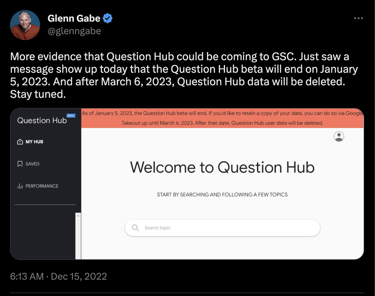 Scott: Yeah. I find this funny. In our last episode, we talked about content ideas coming to Google Search Console. I think it was beta or something. It’s not a big thing yet, but they’re playing with the idea. And we talked about how content ideas looked and resembled Google Question Hub. The next day after recording that episode, Google announced “We were closing the Google Question Hub”. So as of January 15th, the question hub is done. That’s it. And it must be their first closure of property this year. So there we go. Welcome to the new year.