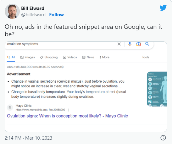 The featured snippet that showed up before the bullet points about ovulation symptoms had the heading in a bold advertisement, and so, he thought, “Oh, no ads and featured Search, like what’s going on here? Is this true?” And it’s not true that it’s not an ad, but what has happened is Google took the heading to tag above an actual advertisement and used that heading as the heading in the featured snippet to say advertisement, so they pulled the data from the Mayo Clinic website.