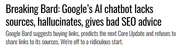 Ross: There’s a funny post by Danny Goodwin on Search Engine Land that says Breaking Bard: Google’s AI chatbot lock sources hallucinate and give bad SEO advice. I love it. I love that title is so brilliant. Google Bard has suggested buying links, predicts the next core update, and refuses to share links to sources.