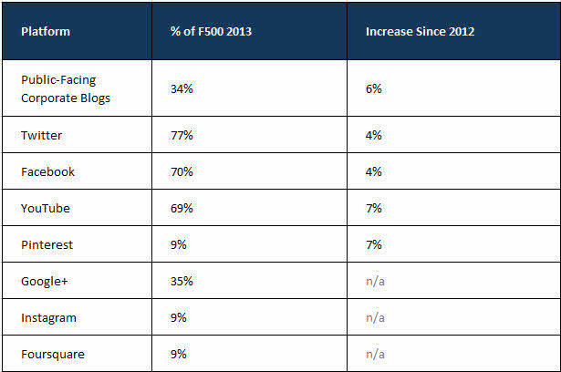 UMass just published their latest study on social media usage within Fortune 500 companies which shows a notable increase in the application and engagement of blogs and a rise in the use of social platforms such as Instagram, Google+ and Foursquare and Pinterest.